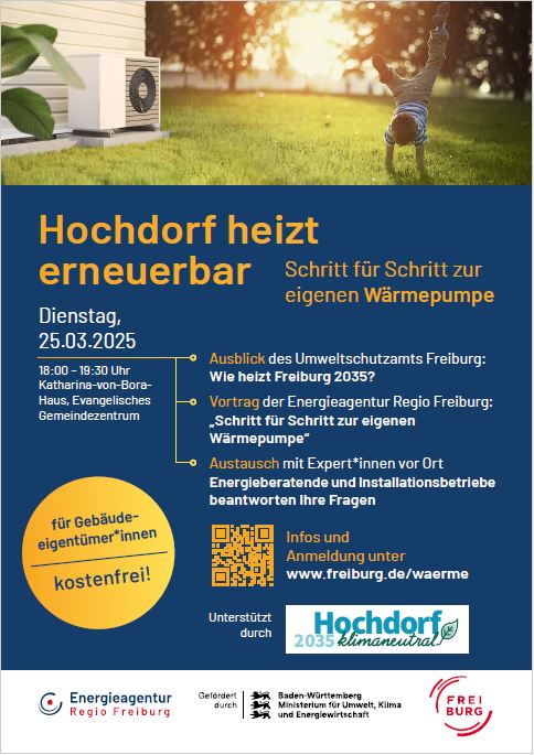 Zur Informations- und Gesprächsveranstaltung „Hochdorf heizt erneuerbar – Schritt für Schritt zur eigenen Wärmepumpe“ lädt auf Dienstag, 25. März, ab 18:00 Uhr die ortschaftsrätliche Initiative „Hochdorf 2035 klimaneutral“ ins Katharina-von-Bora-Haus, Zu den Mühlmatten 6 ein. Gemeinsam mit dem städtischen Umweltschutzamt und der Energieagentur Regio Freiburg gibt es für Gebäudeeigentümer*innen...